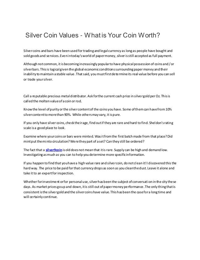 - The silver coin values you will find here on our site are largely based on the retail value you might pay to buy silver coins from a coin dealer. These values assume a coin in a certain grade and are for coins without any signs of damage, such as cleanings, heavy gouges, or other detractions. Certainly, damaged coins are worth less than problem.